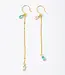 Cette boucle d’oreille NALA-E-GT appartient à la marque belge Murielle Perrotti. Cette boucle d’oreille asymétrique faite à la main présente un design raffiné et moderne. D’un côté pend une pierre rectangulaire vert transparent, tandis que de l’autre se trouve une pierre rectangulaire en cristal, renforçant l’effet asymétrique. Les deux pierres sont soutenues par de fines chaînes dorées ornées de délicats disques, apportant une brillance supplémentaire.