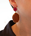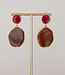 Deze oorring Felipa Bruin trekt meteen de aandacht door hun warme, expressieve kleuren en organische vorm. De bovenzijde in een diepe rode tint contrasteert prachtig met de grote, amberbruine hanger.