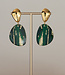 De Oorring Valeria Groen straalt natuurlijke elegantie uit met haar unieke print in donkergroene en beige tinten. De glanzende goudkleurige bovenkant geeft een luxueuze touch, terwijl de organisch gevormde hanger zorgt voor een moderne, vrouwelijke uitstraling. Een stijlvolle eyecatcher die perfect past bij zowel casual als geklede looks.