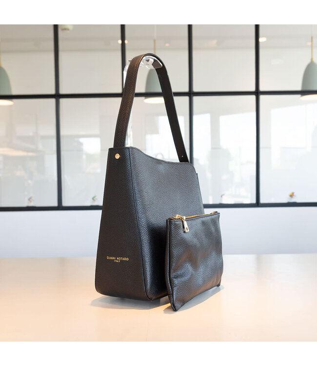 De Alba groot handtas van Gianno Notaro Carol J belichaamt Italiaanse elegantie. Gemaakt van hoogwaardig zacht leder in een rijke zwart tint, biedt deze tas een luxueuze uitstraling en praktische indeling. Met comfortabele handvatten en een (afneembare) schouderriem draag je haar veelzijdig, terwijl het ruime interieur met extra vakken zorgt voor overzicht.