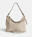 De tas is uitgevoerd in een licht beige geweven structuur die zorgt voor een subtiele textuur en een luchtige, zomerse vibe. De soepele vorm geeft de tas een ontspannen, moderne uitstraling. De schouderriem in bijpassend leer zorgt voor comfort en maakt de tas makkelijk draagbaar.