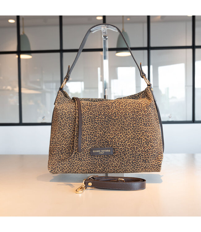 De Antonia handtas van Gianno Notaro Carol J belichaamt Italiaanse elegantie. Gemaakt van hoogwaardig zachte suede in een leopard tint, biedt deze tas een luxueuze uitstraling en praktische indeling. Met comfortabele handvatten en een (afneembare) schouderriem draag je haar veelzijdig, terwijl het ruime interieur met extra vakken zorgt voor overzicht.