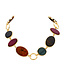 Deze halsketting Kirana Multicolor 2 behoort tot het Belgische label Les Cordes. Deze korte halsketting is een harmonieus spel van kleur en vorm. De goudkleurige ketting wordt onderbroken door grote ovale elementen in warme tinten zoals bordeaux, amber, donkergroen en zwart. Perfect als statement bij een eenvoudige outfit.