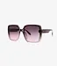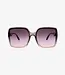Het montuur heeft een oversized, vierkante vorm die zorgt voor een krachtig en flatterend silhouet. De transparante tint verloopt subtiel van donkergrijs/paars aan de bovenkant naar een lichtere roze nuance onderaan, wat de bril een verfijnde en eigentijdse look geeft.