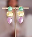 Deze oorring Elenora Giallo behoort tot het Italiaanse label Paviè. Deze verfijnde oorring combineert pastelkleuren in een speels en elegant ontwerp. Bovenaan straalt een ronde steen in frisse mintgroene tint, gevolgd door een rechthoekige steen in botergeel. Onderaan zorgt een druppelvormige facetsteen in roze voor een vrouwelijke en dromerige afwerking.
